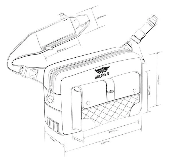 De Aviator Messenger tas heeft een inhoud van 7 liter en een waterdichte liner zodat je een 13-inch laptop mee kan nemen op je motor.Uitgerust met een schouderriem opbergvak met ritsluiting, dit is de ideale plek om je telefoon, rijbewijs of betaalpas te bewaren.De Aviator messenger tas zit schuin op de rug en heeft een afneembare heupband die zorgt voor extra ondersteuning. Als je de heupband los maakt kan de tas door een simpele rotatie onder de rechterarm naar de voorkant van je lichaam gedraaid worden. De tas bevindt zich dan in een rechtopstaande positie, ideaal voor gemakkelijke toegang tot de verschillende compartimenten.De Artonvel Aviator messengerbag is gemaakt van hoogwaardige, duurzame en waterdichte materialen voor dagelijks gebruik en onder alle omstandigheden.Vintage volnerf rundleer en suèdeIntern en extern gevoerd compartiment voor tablet of laptop tot 13 inchExtra vak geïntegreerd in de riem voor het opbergen van een smartphone, creditcard, enz.Externe metalen ring om een sleutelbos, een accessoire enz. op te hangen.Ritsen met YKK-schuifregelaarsBevestigingsriem voor een goede pasvormFlessenopener geïntegreerd in de sluitgespAfmetingen zak: breedte 345 mm – hoogte 250 mm – dikte 95 mm